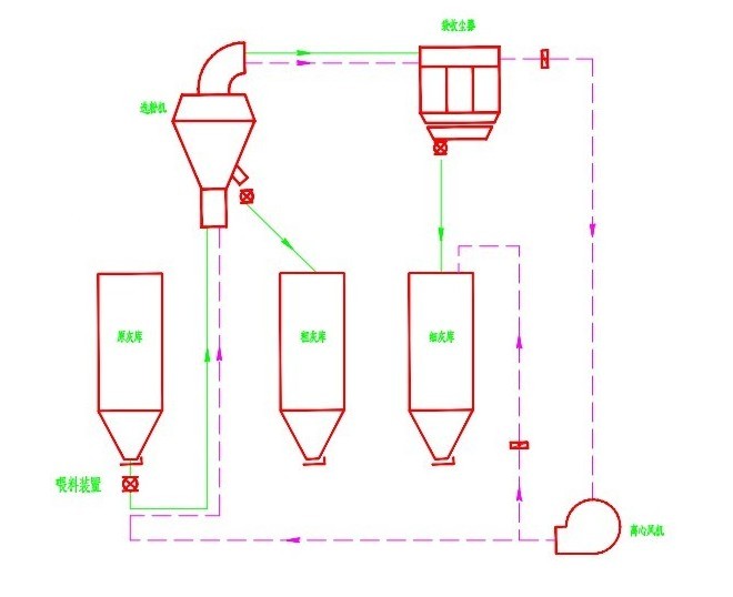 原灰經氣力泵送入粉煤灰選粉機,經選粉機分選后,細灰隨氣流進入在另一庫頂布置的布袋收塵器收集,經卸灰閥至細灰庫。粗灰從選粉機粗粉口排入粗粉庫。